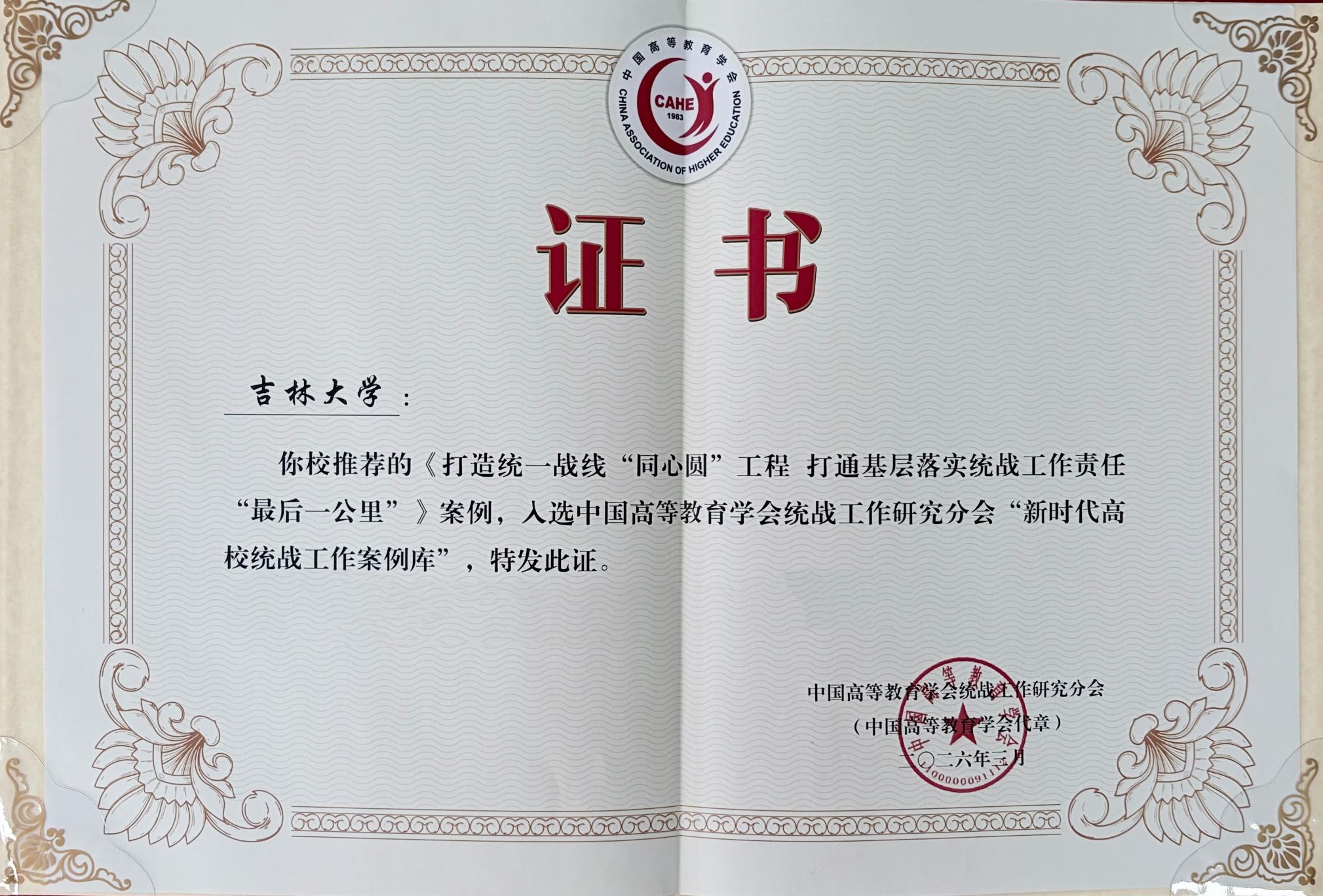 吉林大学此次申报的案例坚持大统战工作格局,打造统一战线“同心圆”工程,以“核心”品牌工程强化领导、扛牢统战工作主责,以“同心”品牌工程凝聚共识、聚焦思政引领主业,以“畅心”品牌工程广集众智、调动统战成员主体,以“聚心”品牌工程带动队伍、建设代表人士主力,以“连心”品牌工程和衷共济、延伸铸牢工作主线,以“齐心”品牌工程守牢底线、增强防范应对主动。吉林大学统一战线以筑牢统战根基、凝聚共识力量为目标,打通基层做好统战工作“最后一公里”。